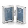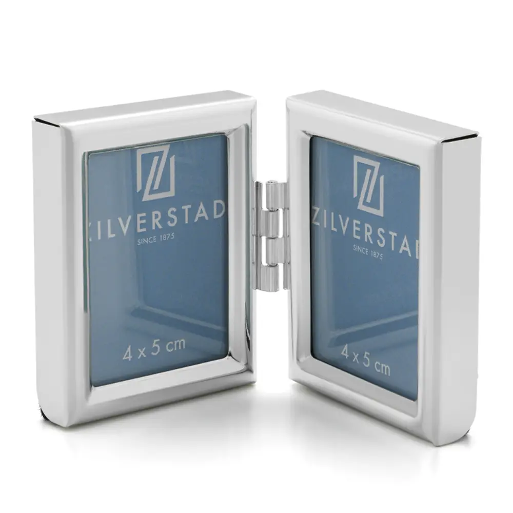 Minirahmen mit schmaler Rundleiste versilbert und anlaufgeschützt, Klarglas und dunkelblauer/schwarzer Velour-Rückwand, Klapprahmen für 2 Fotos 3,5x4,5 cm Passbildformat.