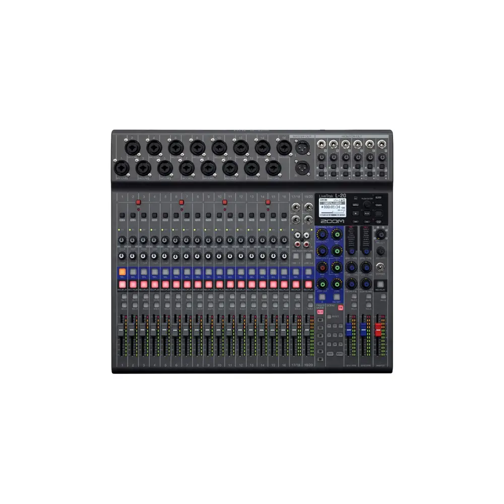 Das digitale Mischpult LiveTrak L-20 bietet alles, was man als kreativer Anwender für die Mischung, das Monitoring und die Aufnahme komplexer Produktionen benötigt. Mit 20 diskreten Audiokanälen und sechs unabhängigen Monitormischungen ist es für umfangreichere Anwendungen ausgelegt.20 Eingänge für ein größeres KlangerlebnisMit dem LiveTrak L-20 mixen Sie im großen Stil. Es bietet 20 Eingänge (16 monophone Mic/Line-Eingänge und zwei Stereoeingänge), jeweils mit eigenem 3-Band-Equalizer mit parametrischen Mitten ausgestattet. Die 16 Monoeingänge bietet zudem eine eigene Kompressorsteuerung. 22 AufnahmespurenNehmen Sie 20 separate Einzelkanäle und eine Stereomischung auf eine SD-Speicherkarte auf. Der LiveTrak L-20 zeichnet Ihre Aufnahmen in makelloser Klangqualität mit Auflösungen bis 24 Bit/96 kHz* auf. Zudem kommen im L-20 unsere bislang fortschrittlichsten Vorverstärker mit einem Rauschabstand von -128 dBu und einer maximalen Vorverstärkung von +60 dB zum Einsatz. Erstellen Sie komplette Mischungen auf dem L-20 oder übertragen Sie Ihre Einzelspuren an eine DAW, um sie dort später zu finalisieren. *Effekte, Equalizer, Overdub-Funktion, Audio-Interface und die Fader-Betriebsarten A-E sind bei 96 kHz nicht verfügbar.Erstellen Sie sechs maßgeschneiderte MonitormischungenMit sechs unabhängigen Monitorausgängen erstellen Sie für jeden Musiker eine eigene Mischung mitsamt Effekten. Diese kann zudem einfach zwischen einem leistungsstarken Kopfhörerausgang und einem symmetrischen Line-Ausgang für Bühnenmonitore umgeschaltet werden. Einer geht aufs Haus!Der LiveTrak L-20 bietet einen separaten siebten Ausgang für den FOH-Techniker. Über diesen Ausgang kann der Techniker die Stereosumme und jede Monitor-/Submischung abhören und zur Zufriedenheit der Musiker optimieren.Produktmerkmale:• 20 diskrete Kanäle (16 Mono- plus zwei Stereokanäle) mit XLR- und 6,3 mm Klinkenbuchsen• Gleichzeitige Aufnahme von 22 Spuren, Wiedergabe von 20 Spuren• USB-Audio-Interface mit 22 Ein- und vier Ausgängen• Audioaufnahme mit bis zu 24 Bit/96 kHz auf SD-Speichermedien• 48 V Phantomspeisung • Hi-Z-Anschlüsse (Kanäle 1-2)• 26 dB Pad (Kanäle 3 bis 16)• Integrierter Kompressor-Regler (Kanäle 1 bis 16)• Solo-Tasten für die einzelnen Kanäle• Variabel steuerbares Hochpassfilter• Summenausgänge und sechs konfigurierbare Monitorausgänge• Separater Kopfhörerausgang für den Toningenieur• Speicherfunktion für bis zu neun Mixerszenen• 20 interne, editierbare Chorus-, Delay- und Halleffekte• Zwei Effekt-Busse • Integriertes Talkback-Mikrofon• Class-Compliant-Betrieb (für iOS-Kompatibilität)• Kompatibel zur Remote Mixer App für das iPad• Fähigkeit zum automatischen Starten und Stoppen der Aufnahme• Pre-Record-Funktion• Im- und Export von Projekten über die USB 2.0 Schnittstelle• Kompatible Funktionen für den ZOOM FS01 Fußschalter• Automatische StromsparfunktionLieferumfang:• LiveTrak L-20• Netzteil (AD-19)• USB 2.0 Kabel• Kurzanleitung